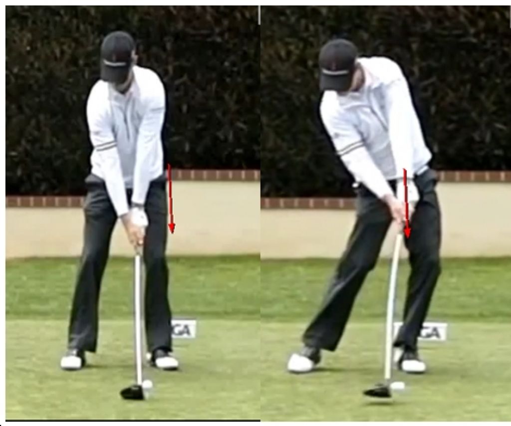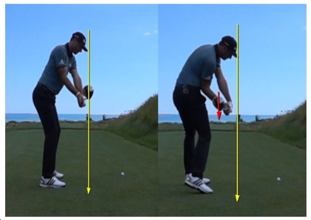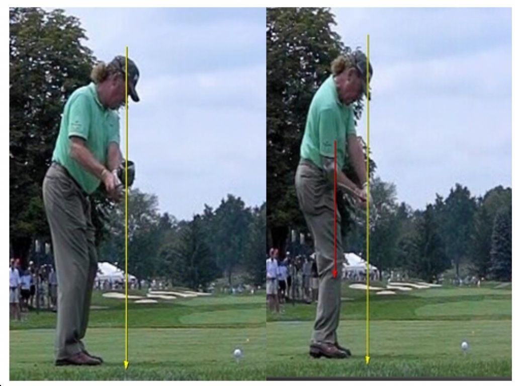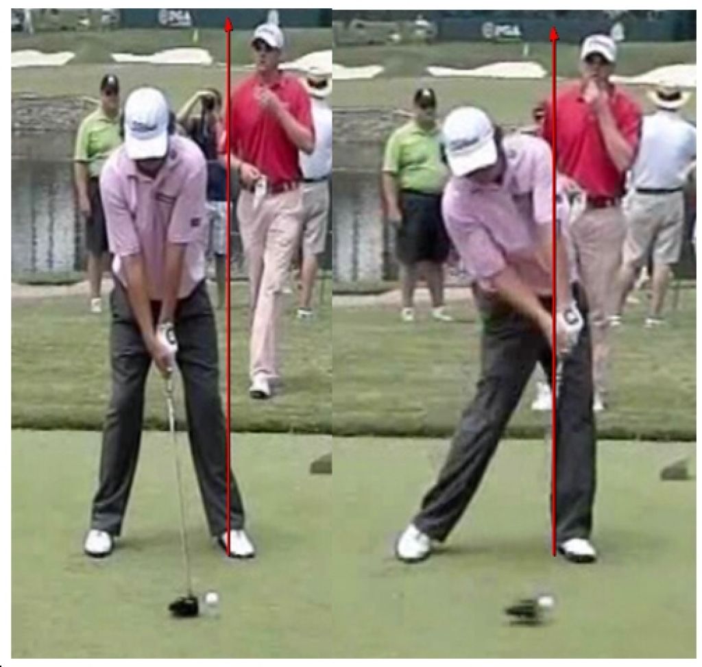 En estas imágenes he trazado una línea vertical y se ve la diferencia entre a colocación y el impacto. La cadera se mueve de forma lateral en la bajada y provoca una inclinación en el cuerpo lo que permite que el palo se mueva también de forma mas ascendente.